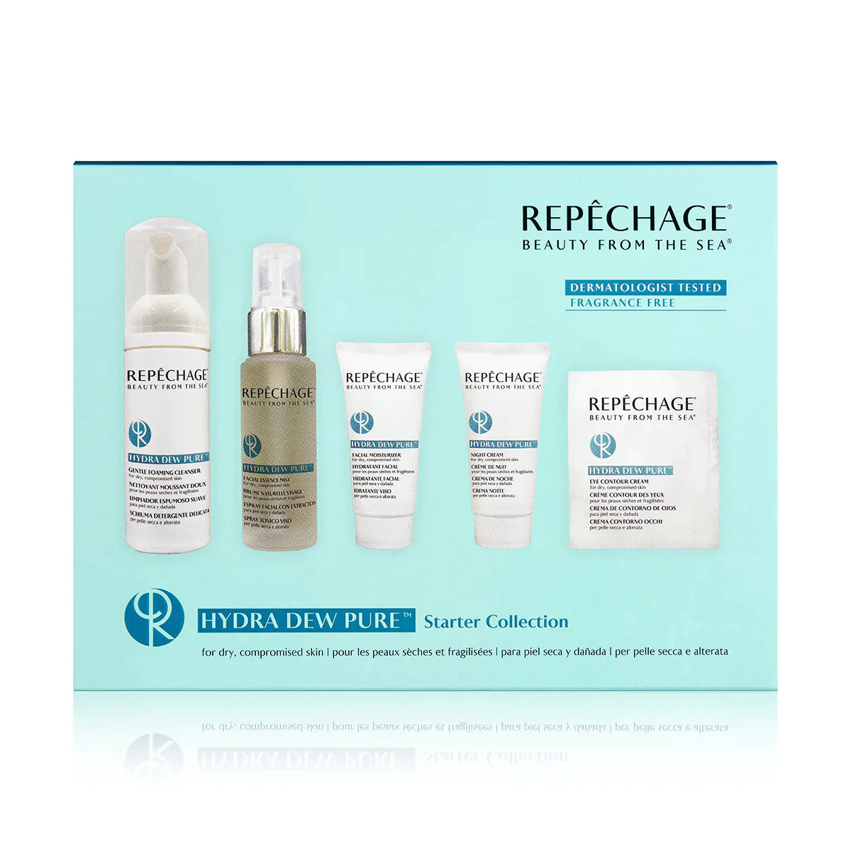Give the gift of pure comfort skin care. The Hydra Dew Pure™ Starter Collection helps to moisturize and restore the appearance of skin with dermatologist reviewed* and clinically proven** formulas that include natural Mastic Water from the Aegean Island of Chios, Camellia Japonica Seed Oil, Repêchage®’s exclusive sustainably-harvested Seaweed extract, and other beneficial botanical ingredients. Contains five at-home care products in convenient starter sizes to help start their pure skincare journey.
